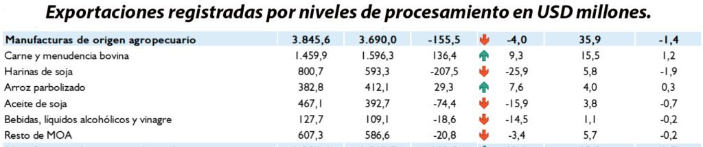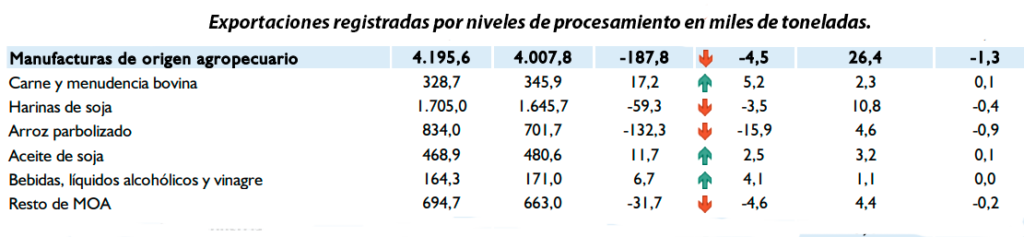 Según el informe de comercio exterior del Banco Central del Paraguay (BCP) las manufacturas de origen agropecuario (MOA), registraron niveles de exportación de 4.007,8 mil toneladas a noviembre de 2024, lo que representó una reducción del 4,5% (menores envíos por 187,8 mil toneladas) respecto al volumen exportado a noviembre de 2023. El arroz parbolizado y la harina de soja fueron los productos que registraron la mayor incidencia negativa en esta agrupación.