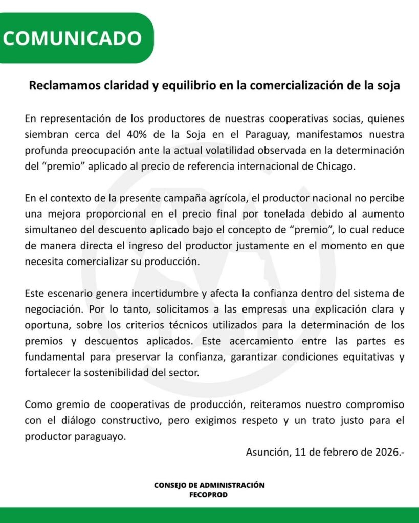 El Consejo de Administración de la Federación de Cooperativas de la Producción (Fecoprod), en representación de los productores de sus cooperativas socias, quienes siembran cerca del 40% de la soja en el Paraguay expresó su profunda preocupación ante la volatilidad observada en la determinación del “premio” aplicado al precio de referencia internacional de Chicago.