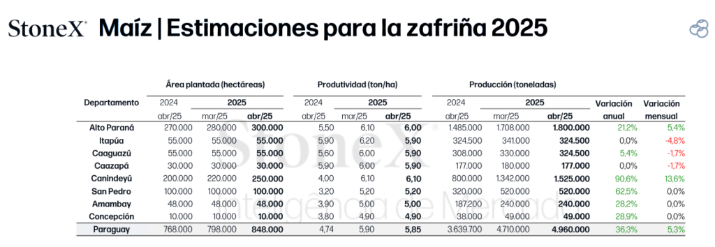 Si bien aún restan algunas semanas para el inicio de la cosecha, el último relevamiento realizado por StoneX indica que se espera una producción de 4,96 millones de toneladas de maíz paraguayo para la zafriña del 2025.