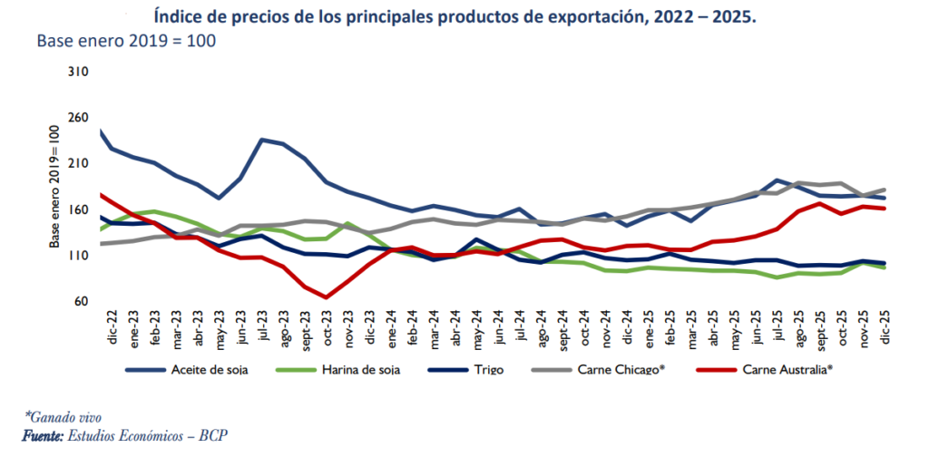 Sobre otros productos importantes para nuestro país que también analiza el BCP, indica que en diciembre de 2025, respecto del mes anterior, se registraron aumentos en las cotizaciones del ganado en pie–Chicago (3,7%); mientras que se observaron reducciones en la harina de soja (-5,5%), el trigo (-2,3%), el aceite de soja (-1,5%) y el ganado en pie–Australia (-1,2%). En términos interanuales, registraron incrementos el ganado en pie–Australia (33,9%), el aceite de soja (21,2%) el ganado en pie– Chicago (19,2%) y la harina de soja (4,0%).