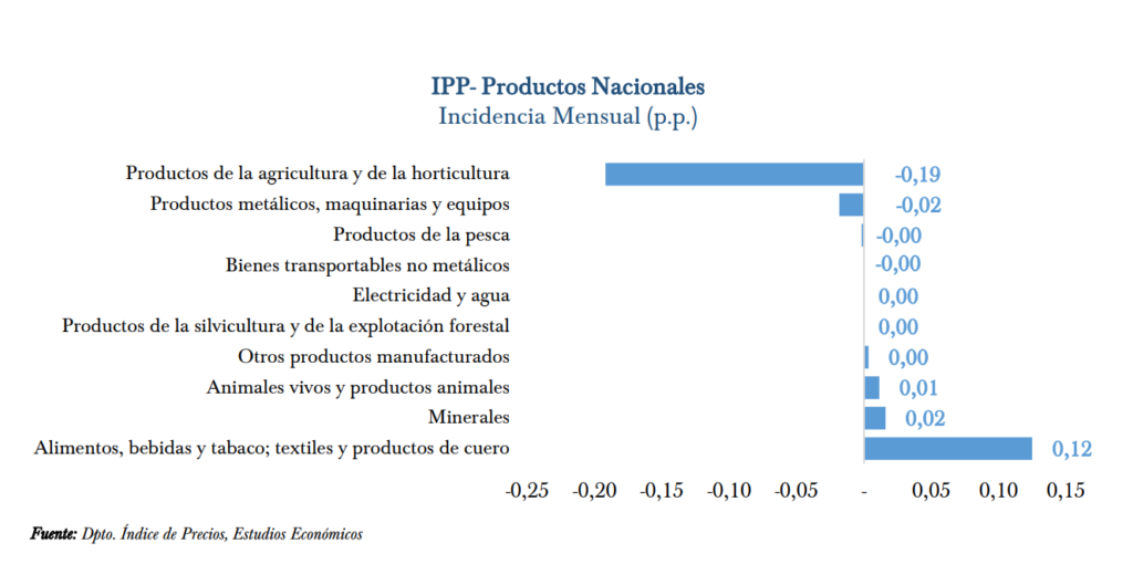 Productos de la pesca exhibió una variación mensual de -1,0%, justificada principalmente por las disminuciones registradas en la subclase de especies de agua dulce (-1,0%). Productos metálicos, maquinarias y equipos registró una disminución de -0,3%, explicada por las variaciones de los precios de los subgrupos productos metálicos (-0,4%) y maquinarias y equipos, incluso de transporte (-0,1%).