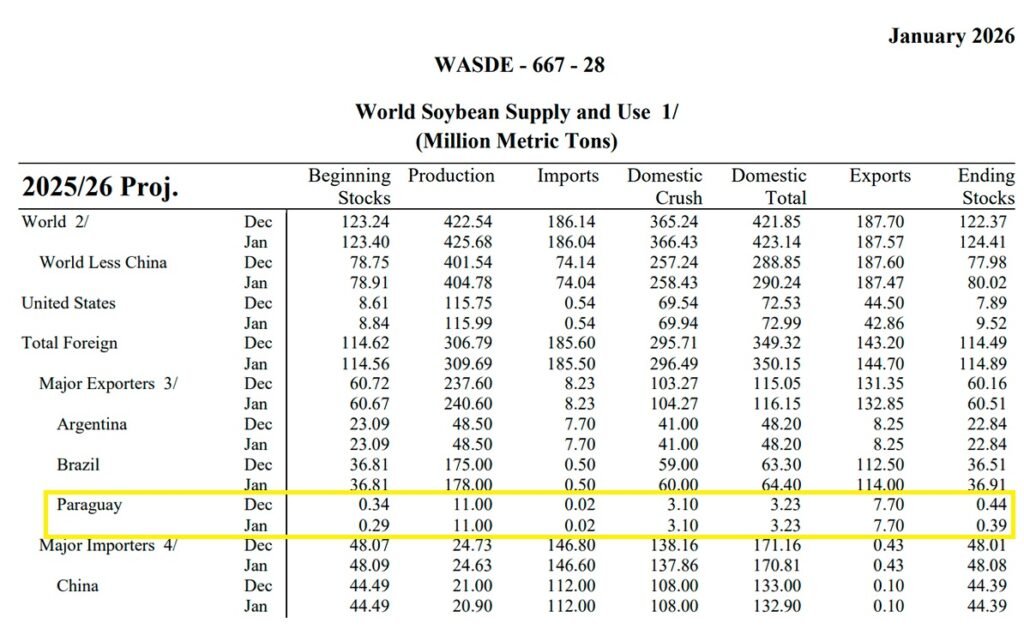 En Paraguay, la zafra 2024/2025 de soja se estima en 10,20 millones de toneladas, con un uso doméstico de 3,70 millones, exportaciones por 6,50 millones y un saldo final de 0,29 millones de toneladas. Para la campaña 2025/2026, la proyección se mantiene sin cambios respecto a diciembre, con una producción estimada de 11 millones de toneladas, un uso interno de 3,23 millones y exportaciones que alcanzarían 7,70 millones de toneladas, reflejando una mayor orientación al mercado externo.