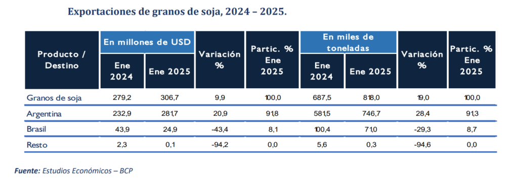 Argentina sigue siendo el principal destino de la soja paraguaya con el 91,8% del total, seguido por Brasil, con el 8,1% de participación.