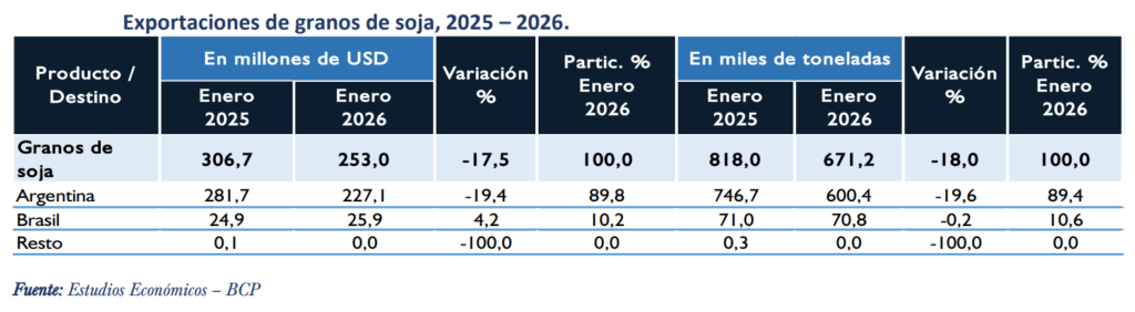 Las exportaciones de soja paraguaya en grano registraron una disminución en enero de 2026. Según el informe de Comercio Exterior del Banco Central del Paraguay (BCP), el valor de la soja descendió de 306,7 millones de dólares en enero de 2025 a 253 millones de dólares en enero de 2026, lo que representa una reducción interanual del 17,5%.