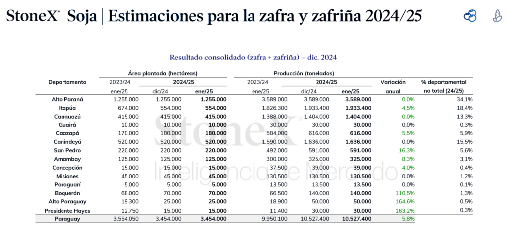 La zafra 2024/25 en Paraguay mantiene una estimación de 10,52 millones de toneladas de producción total, gracias a lluvias que compensaron pérdidas en algunas regiones según el reporte de enero de la consultora StoneX. A pesar de las altas temperaturas las plantaciones muestran un desarrollo prometedor en la mayor parte de la Región Oriental según el informe que también advierte que la ausencia de lluvias previstas para los próximos días podría afectar las plantaciones más tardías.