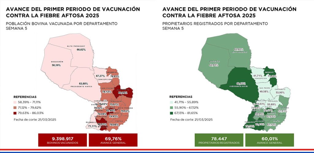 Al cierre de la quinta semana de tareas del primer periodo de vacunación antiaftosa, fueron inmunizados 9.398.917 vacunos marcando un avance general de 69,76% según el informe del Servicio Nacional de Calidad y Sanidad Animal (Senacsa). Los departamentos con mayor avance reportado son Canindeyú, Guairá y Misiones que reportan avances de más del 79%.