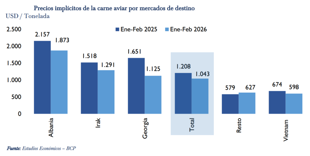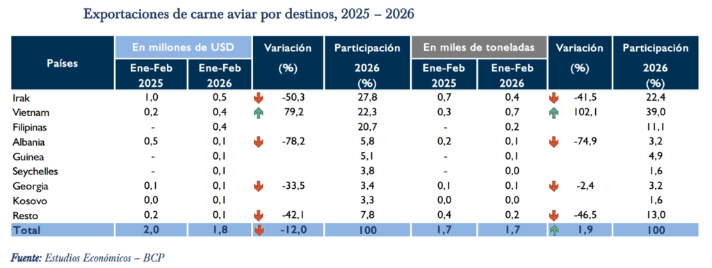 Irak se constituyó en el principal destino de la carne aviar, con una participación de 27,8% en el valor total exportado. Las compras de ese mercado alcanzaron USD 0,5 millones y 0,4 mil toneladas a febrero de 2026. No obstante, este destino mostró una disminución de 50,3% en valor y de 41,5% en volumen con respecto al mismo periodo del año anterior.