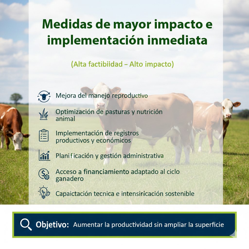Entre las medidas consideradas de mayor impacto y factibilidad inmediata figuran el fortalecimiento del manejo reproductivo, la mejora de pasturas, una nutrición más eficiente, el uso de registros productivos y económicos, así como el acceso a financiamiento adaptado al ciclo ganadero. Estas acciones, indican en el reporte, buscan aumentar la productividad sin expandir necesariamente la superficie, promoviendo una intensificación sostenible.