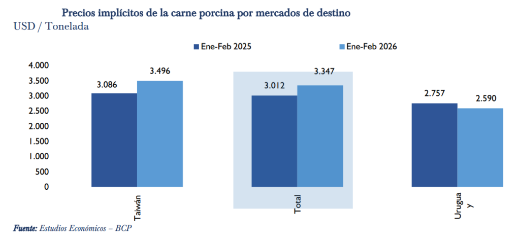En conjunto, los resultados reflejan una evolución favorable de la carne porcina a febrero de 2026, sustentada en el incremento de los envíos en valor y volumen, la mejora en los precios promedio y el mantenimiento de Taiwán como principal mercado de destino.