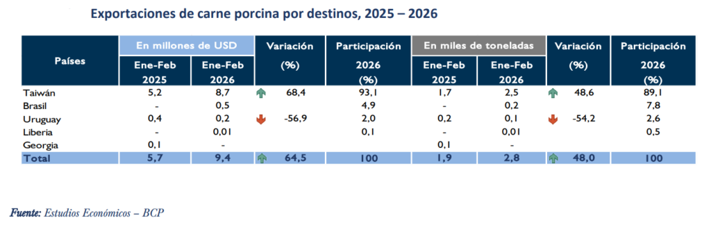 Taiwán se constituyó en el principal destino de la carne porcina paraguaya, con una participación de 93,1% en el valor total exportado y de 89,1% en términos de volumen. Las ventas hacia ese mercado alcanzaron USD 8,7 millones y 2,5 mil toneladas a febrero de 2026.