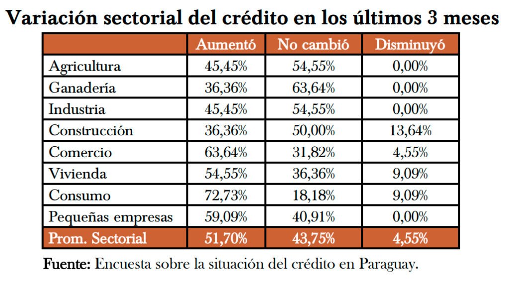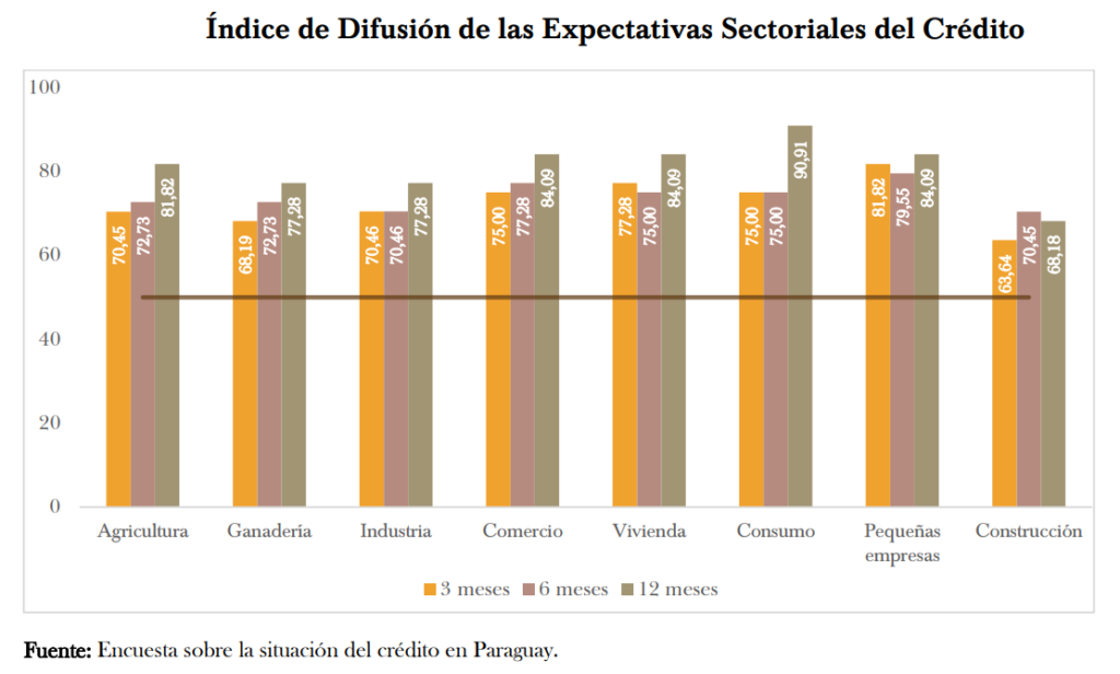 El 77,27% de las entidades encuestadas consideró que la coyuntura económica fue óptima para otorgar créditos al sector privado. Entre los principales aspectos evaluados para la concesión de créditos, el factor económico se mantuvo como el más relevante, seguido del factor climático y del aspecto jurídico.