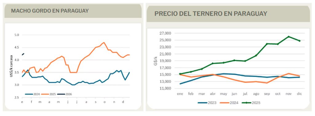 El precio de los terneros bajó en promedio 4,7% en guaraníes en diciembre, dejando atrás el pico de más de G$ 26.000 por kilo alcanzado el mes anterior. Sin embargo, en dólares, la moneda en la que venden los invernadores, la cotización se mantuvo prácticamente inalterada debido a que el guaraní se valorizó casi en la misma proporción en su paridad contra el dólar estadounidense. En el año el ternero subió 63% en guaraníes y 91% en dólares.