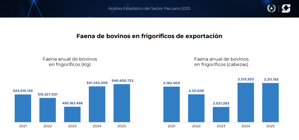 El Servicio Nacional de Calidad y Salud Animal (SENACSA) presentó el informe “Análisis Estadístico del Sector Pecuario: Datos Preliminares al 28 de diciembre de 2025”, en el cual se exponen los datos correspondientes al período 2021–2025. Según el informe, la faena de bovinos en frigoríficos de exportación mostró un comportamiento cíclico, con una fase de contracción inicial seguida de una recuperación que culmina en niveles récord de volumen físico, reflejando la capacidad de adaptación del sector cárnico paraguayo.