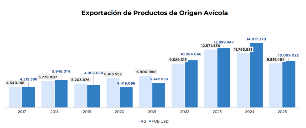 Según este reporte, las exportaciones de productos y subproductos avícolas muestran un crecimiento sostenido en el largo plazo, con una marcada expansión hasta 2023 y una posterior moderación en los últimos dos años. Entre 2017 y 2025, el volumen exportado aumentó de 4,54 millones de kg a 9,59 millones de kg, lo que representa un crecimiento acumulado del 111,3%, mientras que el valor FOB pasó de 4,51 millones USD a 10,10 millones USD, equivalente a un incremento del 123,8%, evidenciando una mejora significativa en la inserción internacional del sector avícola.