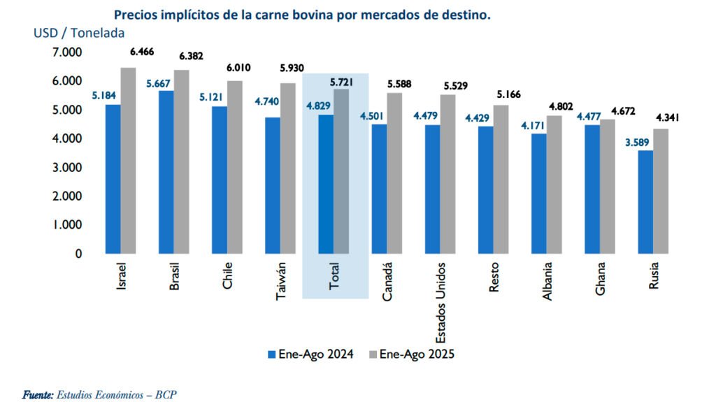 El precio implícito promedio de la carne bovina, a agosto del 2025, se incrementó en 18,5% con respecto al registrado en el mismo periodo del año anterior. Los mayores incrementos se dieron en Taiwán (25,1%), Israel (24,7%) y Canadá (24,2%). En ese sentido, Israel fue el mercado que registró el precio implícito más alto para la carne bovina paraguaya, con un promedio de USD 6.466 por tonelada.