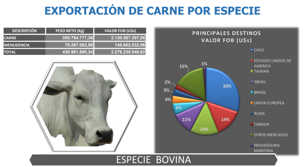Al considerar productos y subproductos de origen animal, que incluyen lácteos, tripas, productos comestibles, termoprocesados, masticables, sebo, cuero, harina, cartílago y páncreas, SENACSA reportó un total de 688.330 toneladas equivalentes por 2.689.190.799 dólares FOB.