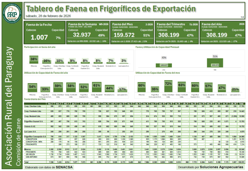 La actividad del mes se desarrolló con un nivel de utilización del 51% de la capacidad total del sistema frigorífico, según el Tablero de Faena en Frigoríficos de Exportación, elaborado por Soluciones Agropecuarias para la Comisión de Carne de la Asociación Rural del Paraguay (ARP), y basado en los registros de SENACSA.
