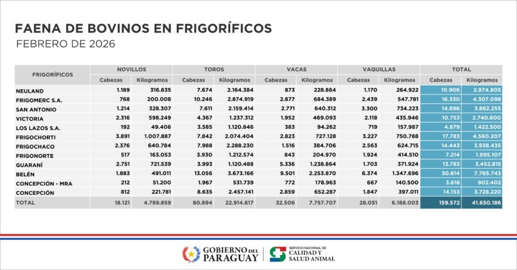 En febrero, la industria cárnica paraguaya registró 159.572 cabezas de ganado bovino procesadas, equivalentes a 41.650.186 kilogramos de carne, según datos del Servicio Nacional de Calidad y Salud Animal (SENACSA). El volumen representó un incremento del 21% respecto a enero, aunque el ritmo de faena todavía se mantiene por debajo de los niveles del año pasado, ya que el acumulado del primer bimestre refleja una caída del 27% frente al mismo periodo de 2025.