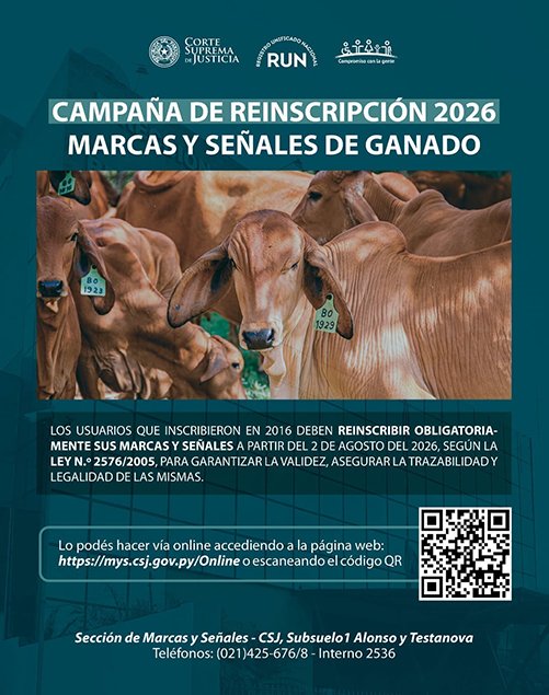 Los usuarios que registraron sus marcas y señales en 2016 deberán reinscribir obligatoriamente sus registros a partir del 2 de agosto de 2026, en cumplimiento de lo establecido en la Ley N.º 2576/2005. El objetivo de esta medida es garantizar la validez de las marcas, así como asegurar la trazabilidad y la legalidad del ganado.