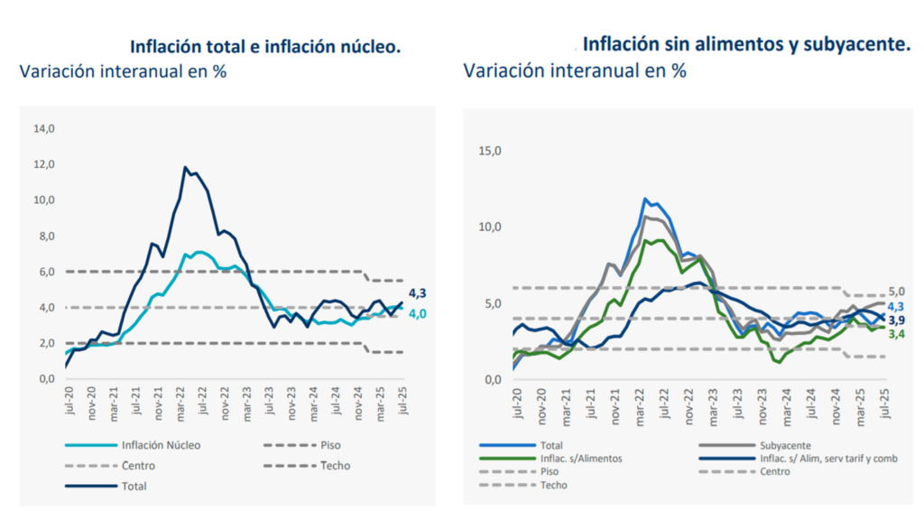 La inflación interanual se ubicó en 4,3%, por encima de la tasa del 4% registrada en junio del corriente, pero por debajo del 4,4% registrado en el mismo período del año anterior. Por otro lado, la inflación núcleo se situó por debajo de la inflación total mensual (en 0,1%). Así, la inflación interanual medida por este indicador fue del 4%, similar a la tasa del mes anterior, pero mayor al 3,2% registrado en el mes de julio de 2024.