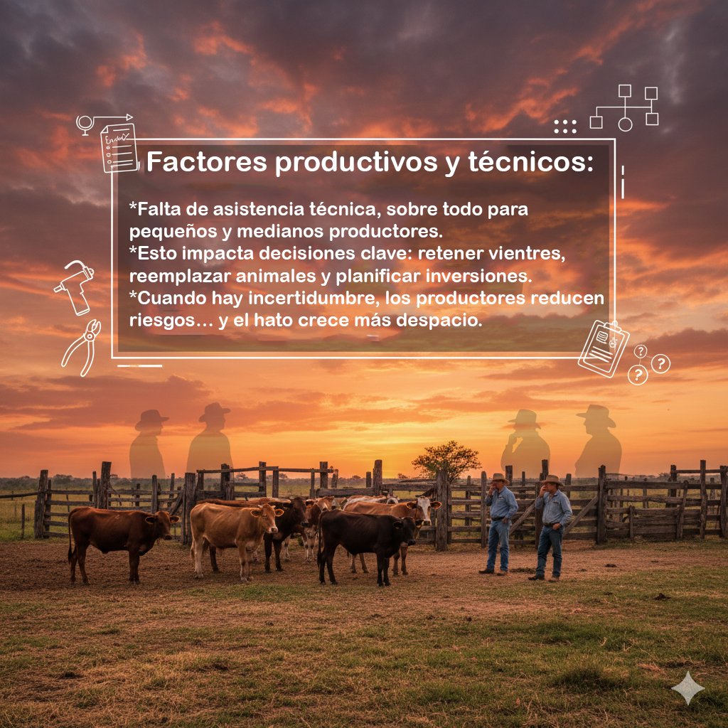 Entre las causas identificadas se destacan la variabilidad y baja previsibilidad de los precios, la incertidumbre económica, las sequías recurrentes y el impacto del cambio climático. A esto se suman limitaciones en el acceso a financiamiento con plazos adecuados al ciclo ganadero, dificultades para acceder a mercados diferenciados y debilidades en la asistencia técnica, especialmente para pequeños y medianos productores.