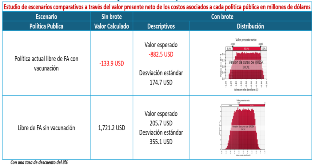 El estudio presentado incluye una evaluación económica proyectada a diez años, que compara dos escenarios: continuar con el esquema actual de libre de fiebre aftosa con vacunación (con un costo estimado de USD 133 millones), y un escenario alternativo sin vacunación, que podría generar beneficios netos por USD 1.700 millones. Incluso en modelos que simulan eventuales brotes, el escenario sin vacunación mostró mayor resiliencia económica, con probabilidades de saldo positivo en el 67% de los casos simulados.