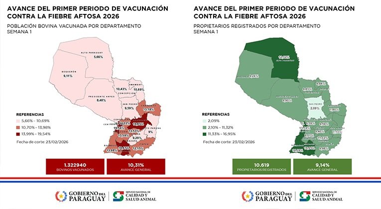 El primer periodo de vacunación contra la fiebre aftosa 2026 en Paraguay superó el 10% de cobertura del rodeo bovino en su primera semana de ejecución. Según el corte de información al 23 de febrero, difundido por el Servicio Nacional de Calidad y Sanidad Animal (Senacsa), ya fueron vacunadas 1.322.940 cabezas, lo que representa un avance del 10,31% a nivel nacional.