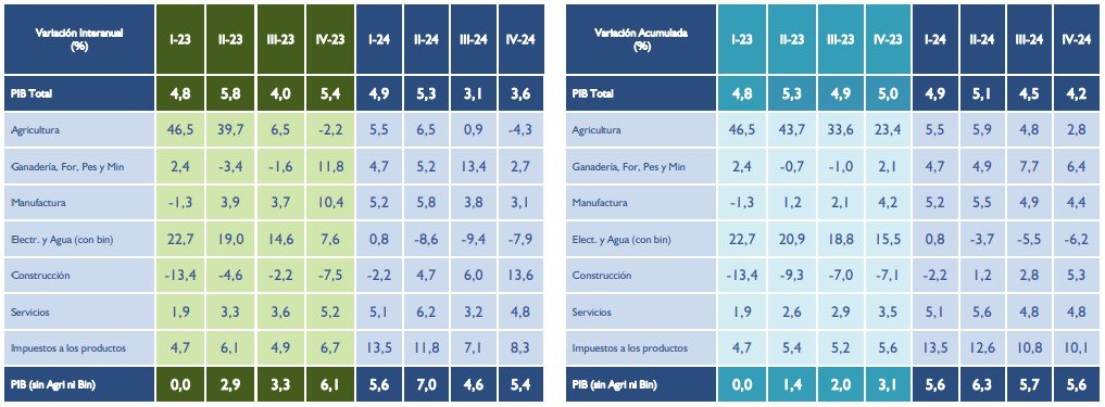 En 2024 cerró con una variación positiva de 4,2% del Producto Interno Bruto acumulada en el año según el BCP. Cada reporte incluye un dato que separa la agricultura y binacionales por el peso que tienen el PIB local, sin estos dos, la variación acumulada del PIB fue de 5,6%. El sector energía registró una importante caída de 7,9% interanual, y 6,2% acumulado, mientras que la variación de la agricultura en el último cuatrimestre cayó 4,3%. La variación en el año de la agricultura sumó 2,8% y la ganadería 6,4%.