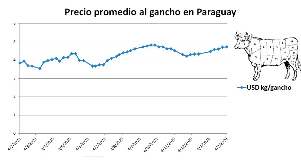 El precio promedio del ganado bovino al gancho en Paraguay se ubicó en USD 4,73 por kilogramo, según informó la Comisión de la Carne de la Asociación Rural del Paraguay (ARP). La comparación interanual muestra incrementos significativos en todas las categorías, lo que indica una tendencia alcista sostenida, aunque con ritmos diferenciados según mercado de destino y tipo de animal.