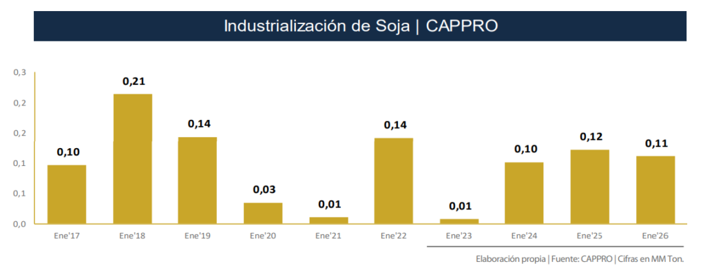 La industria oleaginosa paraguaya inicia el año con perspectivas optimistas, sustentadas en una buena cosecha y en la continuidad de condiciones externas favorables, que podrían permitir procesar más de 11,5 millones de toneladas de soja al cierre del año, consolidando la importancia del agregado de valor en la agroindustria nacional, según el último informe publicado por la Cámara Paraguaya de Procesadores de Oleaginosas y Cereales (CAPPRO).