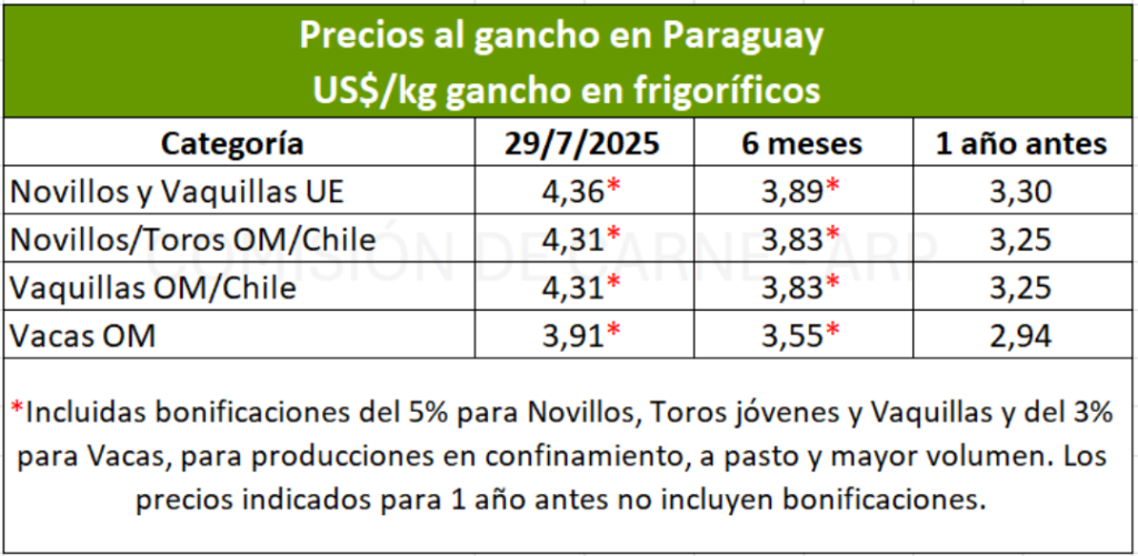 El precio del novillo paraguayo alcanzó los USD 4,31 por kilo gancho al 29 de julio, marcando una suba interanual significativa, según el informe de la Comisión de la Carne de la Asociación Rural del Paraguay (ARP). El repunte, impulsado por la mejora en la demanda externa y una oferta local limitada, también se refleja en las bonificaciones diferenciadas y en la normalización del mercado tras la presión bajista de junio.