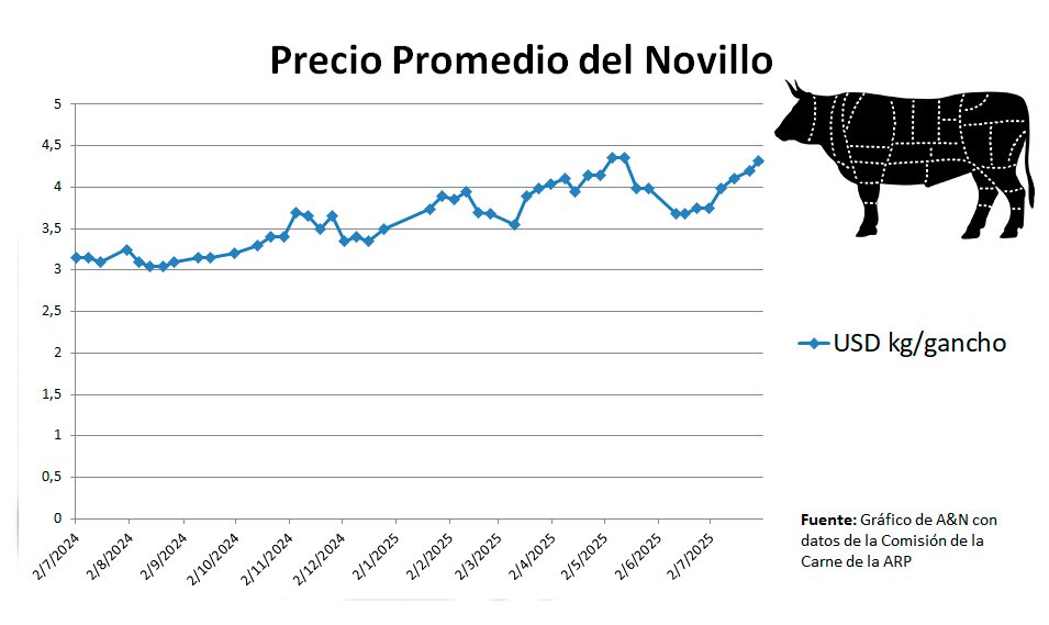 El precio del novillo llegó a USD 4,31 por kilo gancho al 29 de julio, según el informe semanal de la Comisión de la Carne de la Asociación Rural del Paraguay (ARP). El reporte recuerda que seis meses atrás se ubicaba en USD 3,83/kg gancho, lo que evidencia una recuperación sostenida.