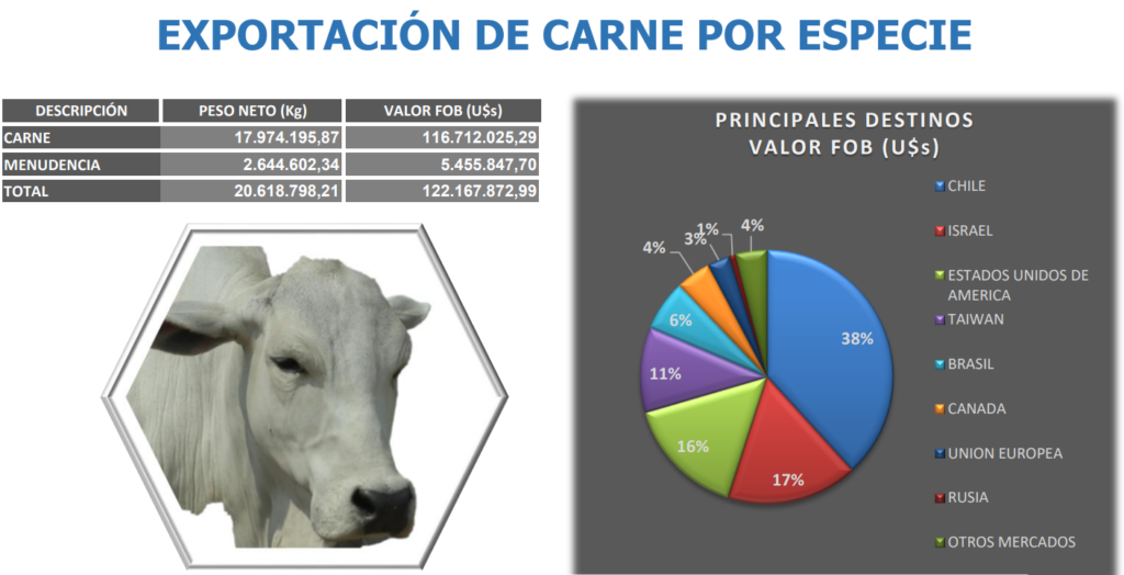 Según el informe de Senacsa “Avance de Valores Certificados Sanitarios Emitidos para Exportación de Carnes, Menudencias, Productos y Subproductos. Enero 2026”, las exportaciones del sector bovino sumaron 20.618 toneladas por un valor de USD 122.167.872 FOB durante el primer mes del año.