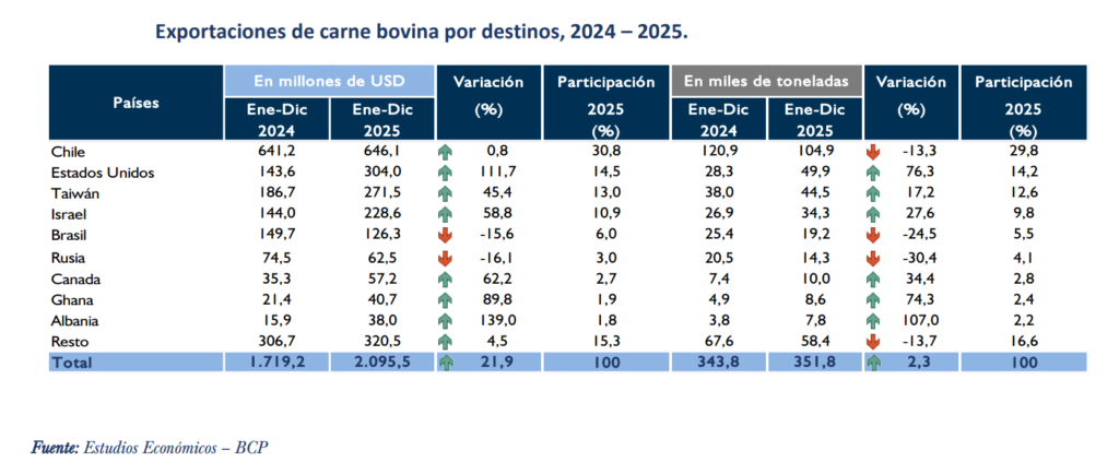 Las exportaciones de carne bovina en 2025 alcanzaron USD 2.095,5 millones, representando un incremento del 21,9% con respecto al monto acumulado a diciembre del 2024, mientras que, en términos de volumen, se registró un incremento de 2,3% con respecto al mismo periodo del 2024, informó el equipo del Banco Central del Paraguay en el boletín de comercio exterior de diciembre. El precio implícito promedio se incrementó en 19,1%.
