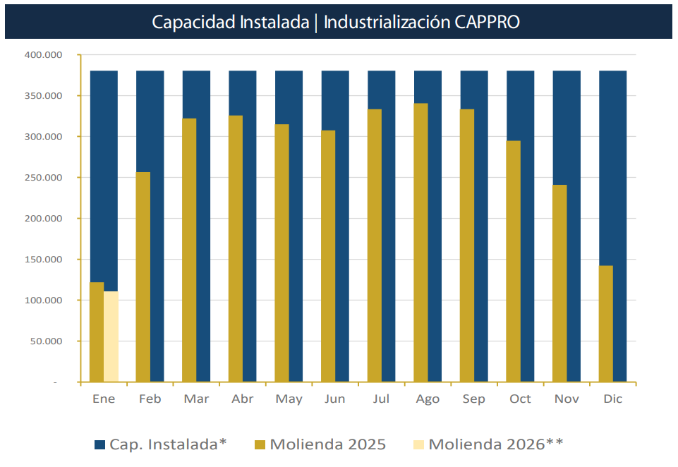 En 2018, la suspensión de operaciones de una de las plantas redujo la capacidad disponible a poco más de 4,2 millones de toneladas anuales. La reciente reanudación de la molienda restituye esa capacidad al sistema y fortalece nuevamente la infraestructura industrial del país.