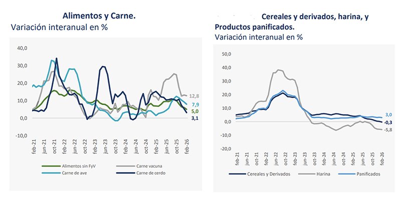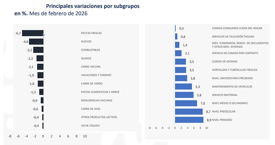 En conjunto, la agrupación de bienes alimenticios registró una variación mensual de -0,8% en febrero de 2026. En términos interanuales, la inflación de los alimentos se situó en 6,2%. Si se excluyen frutas y verduras, la variación interanual fue del 5,0%, mientras que el subgrupo de frutas y verduras mostró una alta volatilidad con un incremento del 14,3% en el último año.