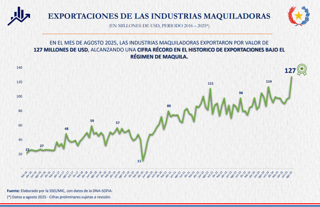 En el mes de agosto 2025, las industrias maquiladoras exportaron por valor de 127 millones de USD, alcanzando una cifra récord en el histórico de exportaciones bajo el régimen de maquila, indica un reporte elaborado por el Ministerio de Industria y Comercio (MIC). El número de las exportaciones acumuladas en el año ya suma USD 801 millones, lo cual representa un incremento de 83 millones de USD con respecto al mismo periodo del año anterior.