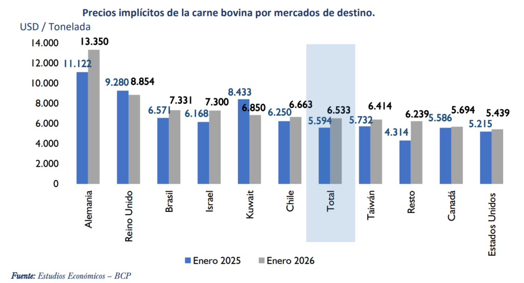 El precio implícito promedio de la carne bovina, en enero del 2026, se incrementó en 16,8% con respecto al registrado en el mismo periodo del año anterior, pasando de USD 5.594 por tonelada en enero de 2025 a USD 6.533 en enero de 2026.