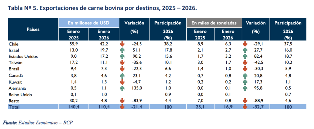 Las exportaciones de carne bovina de Paraguay cayeron en enero de 2026 a USD 110,4 millones, un descenso del 21,4% en valor y del 32,7% en volumen respecto al mismo mes de 2025, según el informe de comercio exterior del Banco Central del Paraguay. Además el precio implícito promedio se incrementó en 16,8% con respecto al registrado en el mismo periodo del año anterior.