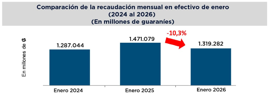 En enero de 2026, la Dirección Nacional de Ingresos Tributarios (DNIT) registró una recaudación en efectivo de ₲ 3.209.894 millones (482,1 millones de USD ), lo que representa un incremento interanual de 0,7% respecto al mismo mes de 2025. Este resultado implicó una variación positiva de ₲ 21.954 millones más (USD 3,3 millones).