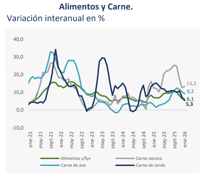 En el mismo sentido, las carnes de cerdo registraron subas de precios, en línea con su condición de bien sustituto de la carne vacuna, mientras que la carne de aves también presentó variaciones positivas durante el mes, según el ranking de principales subgrupos del IPC. Asimismo, se observaron incrementos en los precios de embutidos, carnes conservadas y derivados de la carne, ampliando el impacto inflacionario dentro del complejo cárnico.
